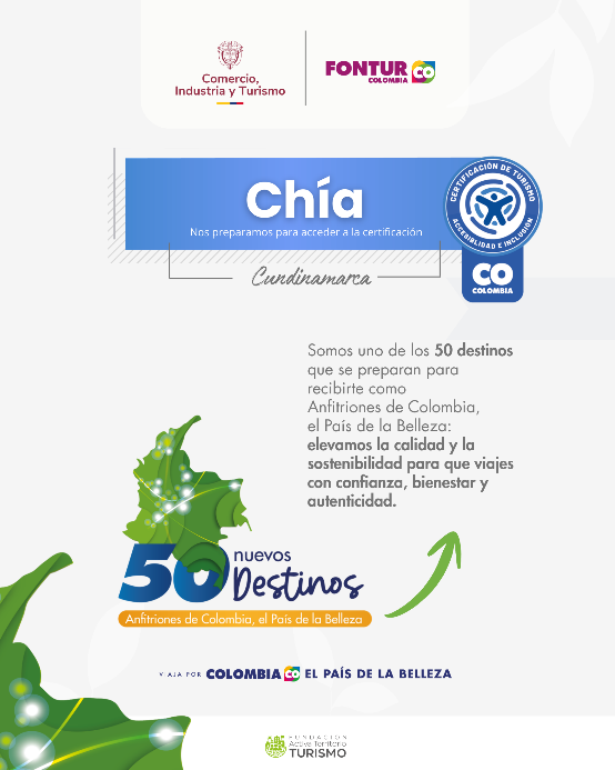 En este contexto, el proceso contempla la implementación de diferentes Normas Técnicas Colombianas (NTC) en los destinos beneficiarios del proyecto FNTP-2024-095 “Programa Nacional de Calidad Turística”. Para el caso de Chía, se ha definido la aplicación de la NTC 6654 en turismo accesible, en el marco de su selección dentro de la convocatoria “Accesibilidad Universal en 10 Destinos Turísticos de Colombia”. De esta manera, el municipio avanza en la consolidación de una oferta turística más inclusiva, organizada y accesible para todos. Para ello, se cuenta con el acompañamiento técnico brindado por la Fundación Activa Territorio (FUNDATER), en su calidad de operador designado por FONTUR, en articulación con el Ministerio de Comercio, Industria y Turismo, mediante acciones de diagnóstico, capacitación y fortalecimiento de capacidades de los actores de la cadena de valor.